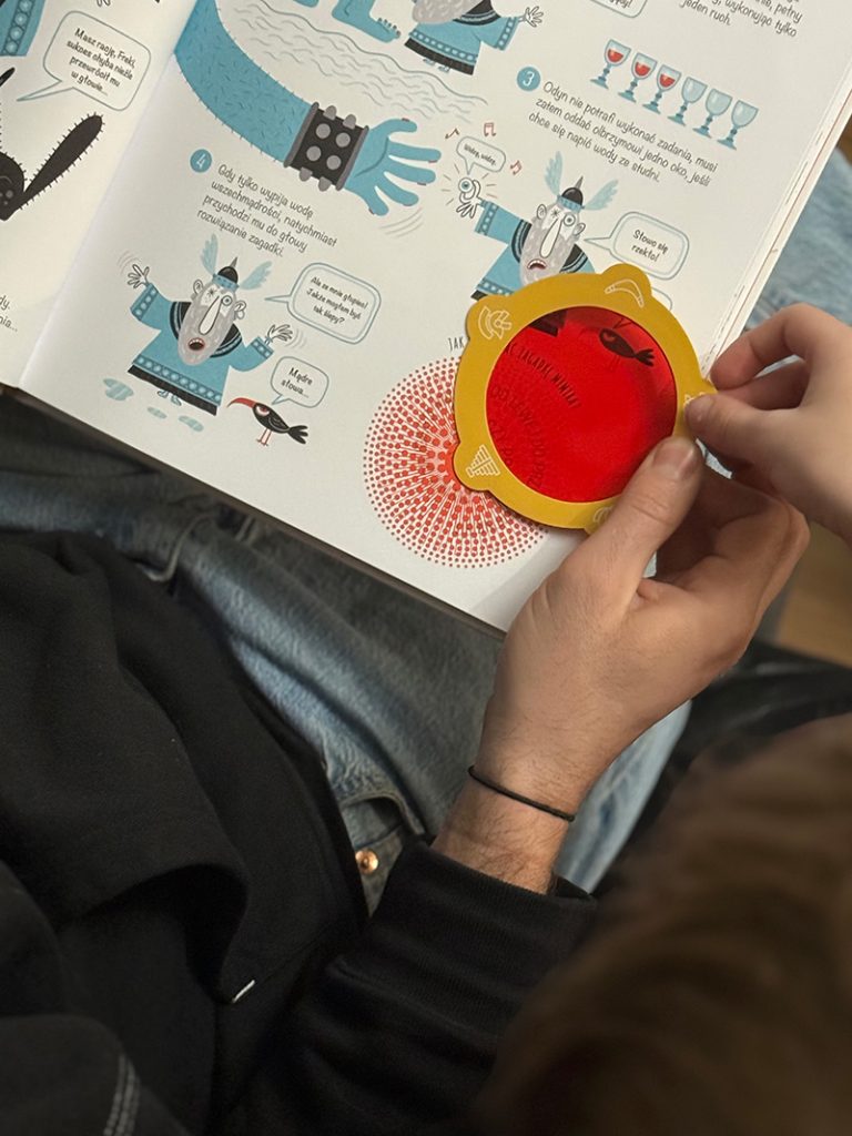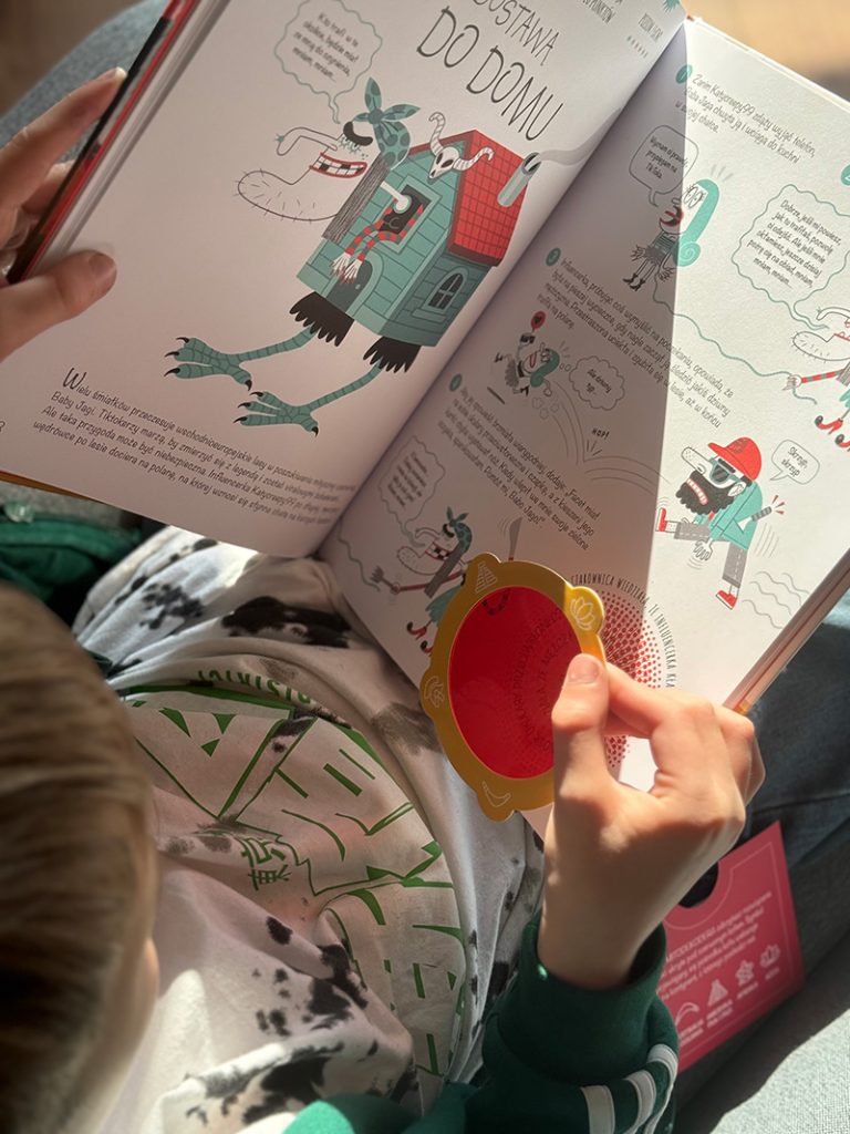 Każda zagadka zaczyna się krótkim wprowadzeniem, po którym pojawiają się poszlaki pomagające dotrzeć do rozwiązania. Historie są wzbogacone o lekkie, często zabawne dialogi / teksty w dymkach, są to takie małe przerywniki, które ja bardzo lubię w książkach dla dzieci. Ciekawym i jednocześnie prostym pomysłem jest dołączone kolorowe szkiełko, po przyłożeniu go do czerwonego pola możemy sprawdzić poprawną odpowiedź. To drobiazg, który robi ogromne wrażenie, szczególnie na dzieciach (przyznaję, że na mnie też).